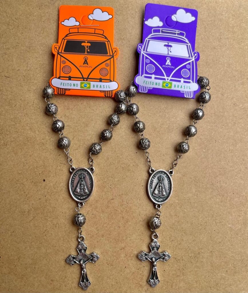 Dezena confeccionada para pendurar no retrovisor, acompanhando você com oração e devoção em suas viagens.